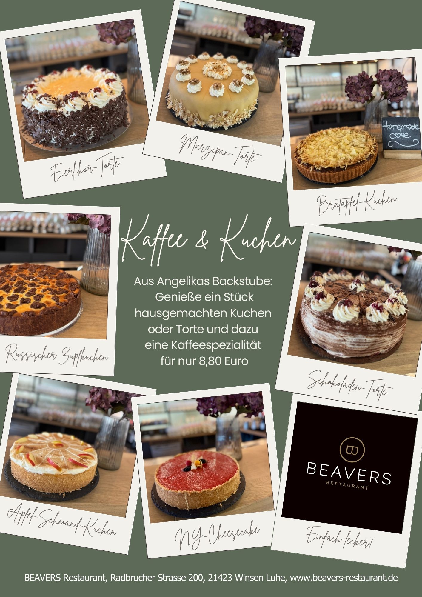 Wechselnde Kuchen & Torten aus Angelikas Backstube. Dienstag bis Sonntag von 12:00 Uhr bis 18:00 Uhr. AUCH ZUM MITNEHMEN !!!